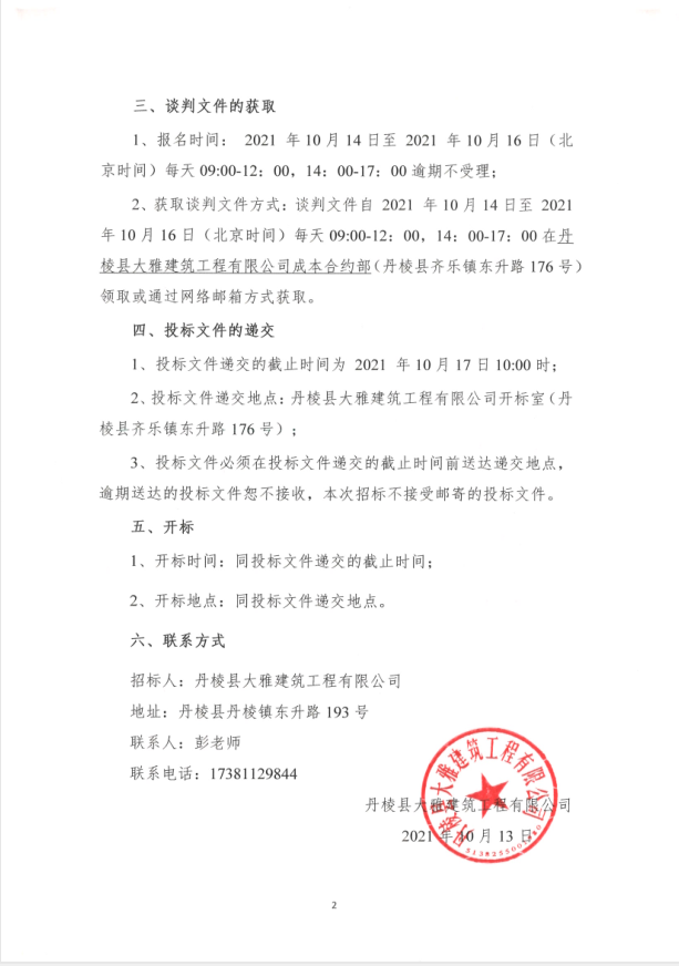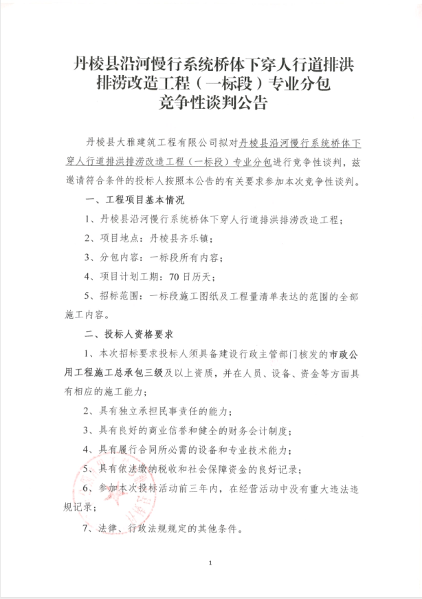 【大雅建筑公司】丹棱縣沿河慢行系統(tǒng)橋體下穿人行道排洪排澇改造工程(一標(biāo)段)專(zhuān)業(yè)分包競(jìng)爭(zhēng)性談判公告