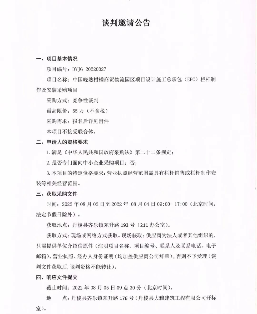 中國晚熟柑橘商貿(mào)物流園區(qū)項目設(shè)計施工總承包(EPC)欄桿制作及安裝采購項目談判邀請公告