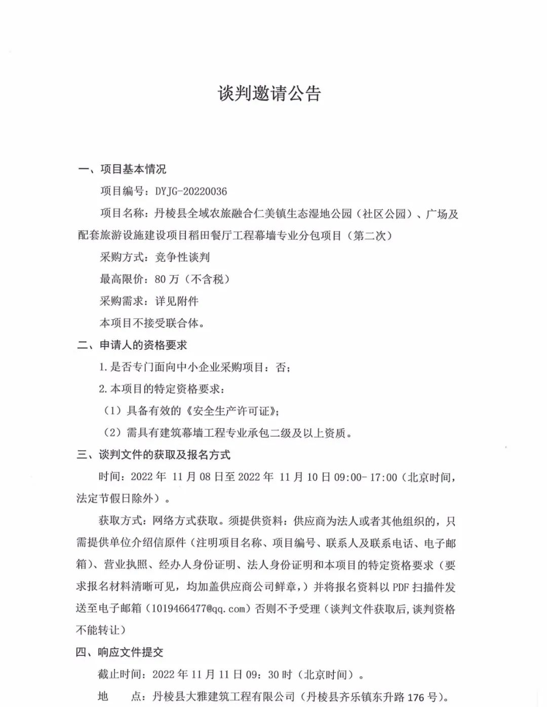 丹棱縣全域農(nóng)旅融合仁美鎮(zhèn)生態(tài)濕地公園(社區(qū)公園)、廣場(chǎng)及配套旅游設(shè)施建設(shè)項(xiàng)目稻田餐廳工程幕墻專業(yè)分包項(xiàng)目(第二次)談判邀請(qǐng)公告