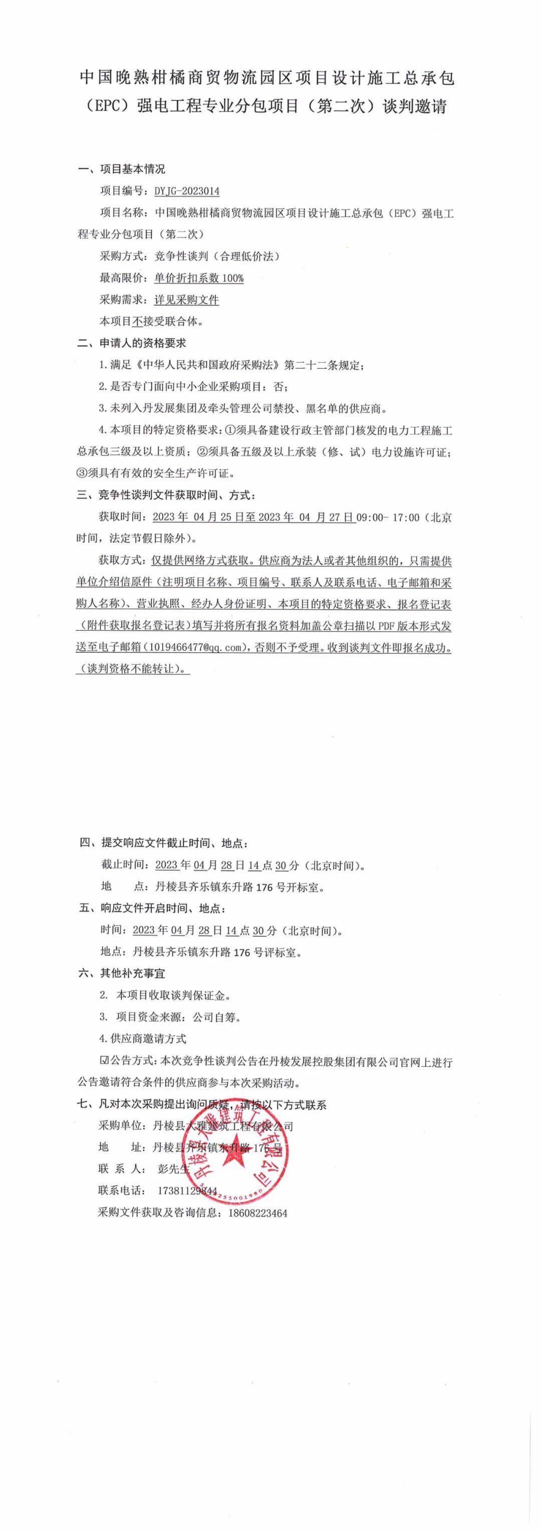 中國晚熟柑橘商貿(mào)物流園區(qū)項目設(shè)計施工總承包(EPC)強電工程專業(yè)分包項目(第二次)競爭性談判邀請
