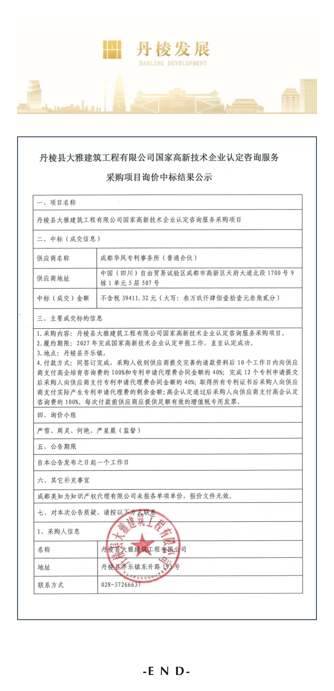 丹棱縣大雅建筑工程有限公司國家高新技術(shù)企業(yè)認(rèn)定咨詢服務(wù)采購項目詢價中標(biāo)結(jié)果公示