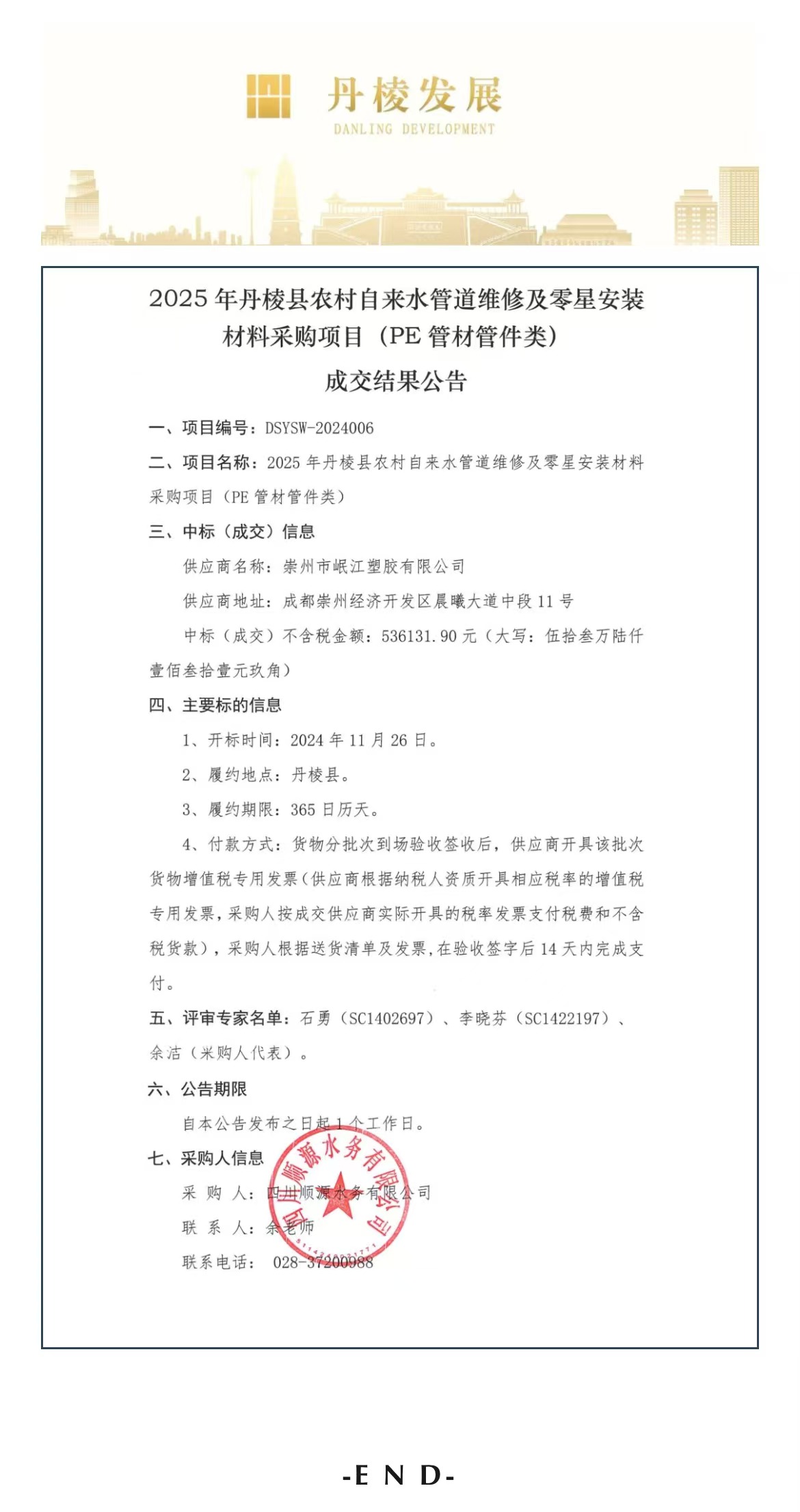 2025年丹棱縣農村自來水管道維修及零星安裝材料采購項目(PE管材管件類)成交結果公告