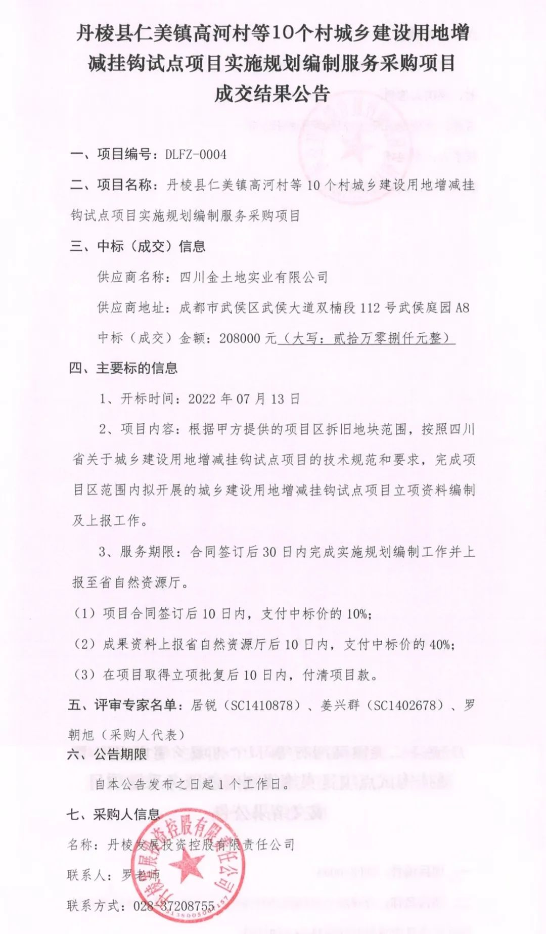 丹棱縣仁美鎮(zhèn)高河村等10個村城鄉(xiāng)建設(shè)用地增減掛鉤試點項目實施規(guī)劃編制服務(wù)采購項目成交結(jié)果公告
