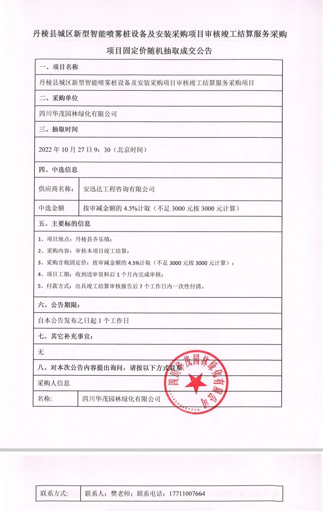 丹棱縣城區(qū)新型智能?chē)婌F樁設(shè)備及安裝采購(gòu)項(xiàng)目審核竣工結(jié)算服務(wù)采購(gòu)項(xiàng)目固定價(jià)隨機(jī)抽取成交公告
