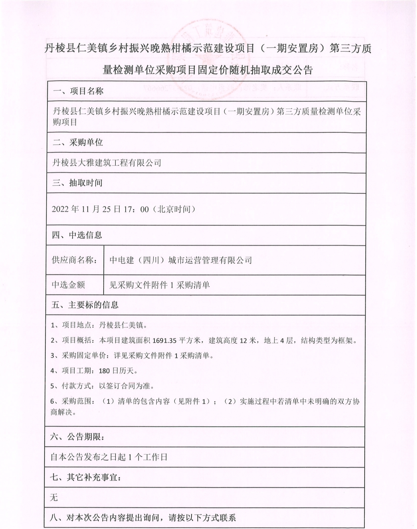 丹棱縣仁美鎮(zhèn)鄉(xiāng)村振興晚熟柑橘示范建設(shè)項(xiàng)目(一期安置房) 第三方質(zhì)量檢測單位采購項(xiàng)目固定價隨機(jī)抽取成交公告