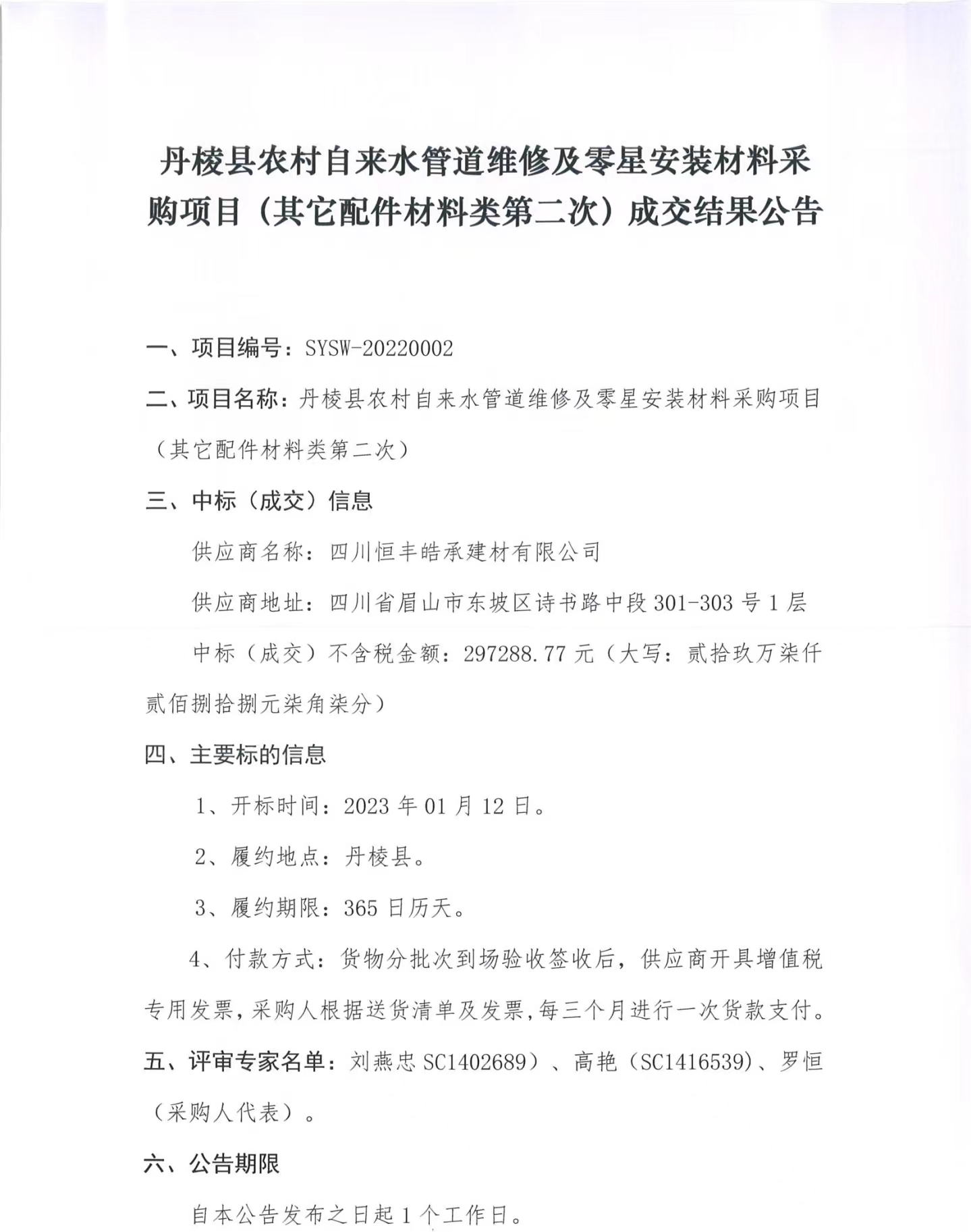 丹棱縣農(nóng)村自來水管道維修及零星安裝材料采購項目(其它配件材料類第二次) 成交結果公告