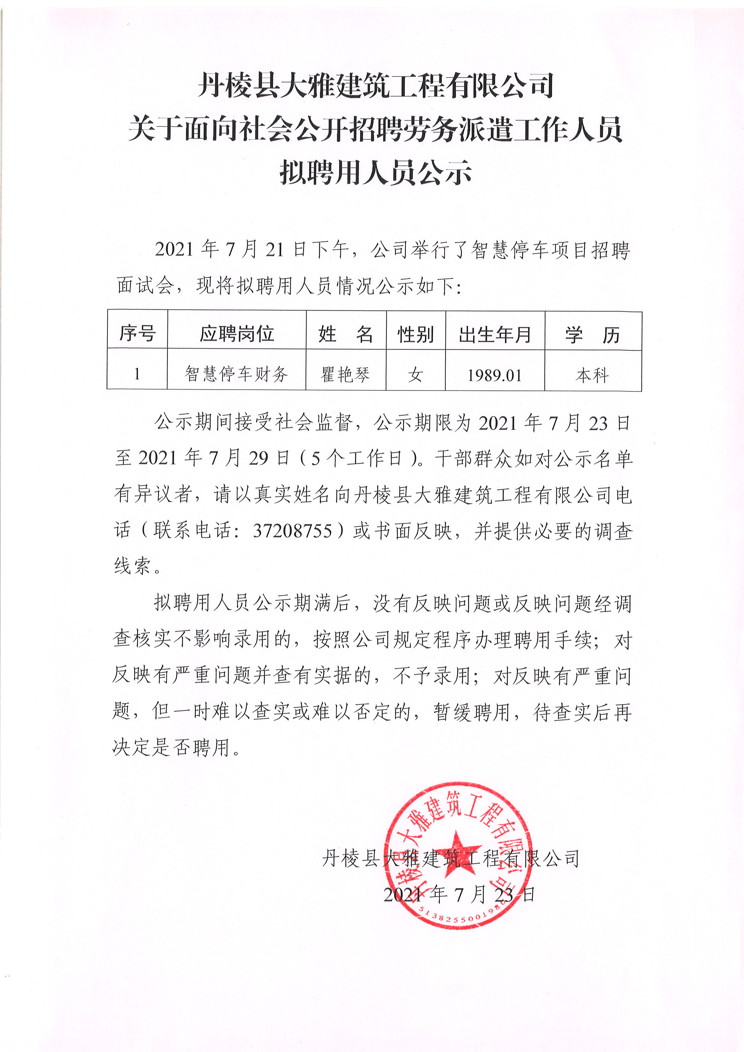 【大雅建筑公司】關于面向社會公開招聘勞務派遣工作人員擬聘用人員公示