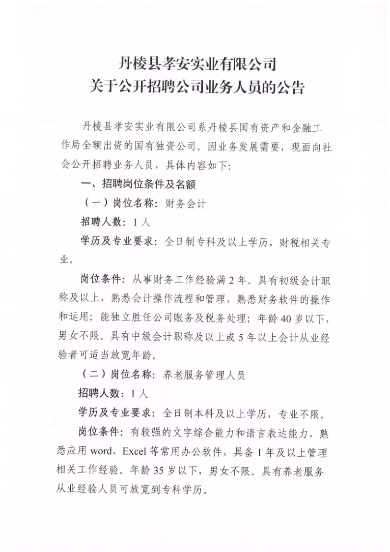 【縣孝安公司】丹棱縣孝安實(shí)業(yè)有限公司關(guān)于公開(kāi)招聘公司業(yè)務(wù)人員的公告