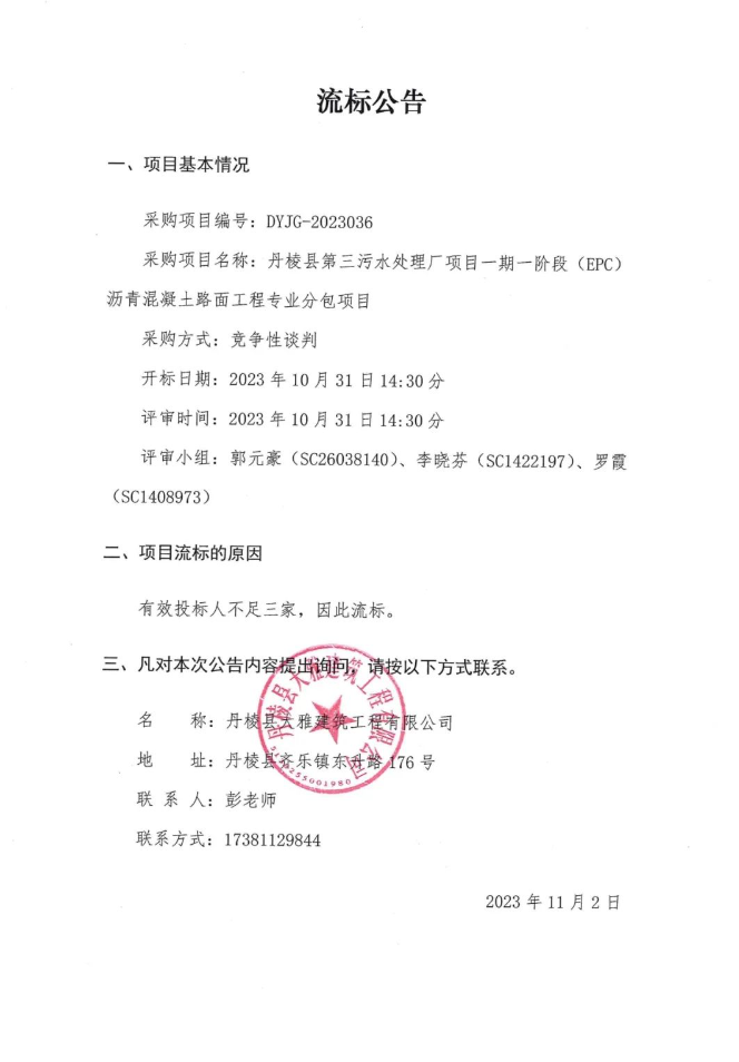 丹棱縣第三污水處理廠項目一期一階段(EPC)瀝青混凝土路面工程專業(yè)分包項目流標公告