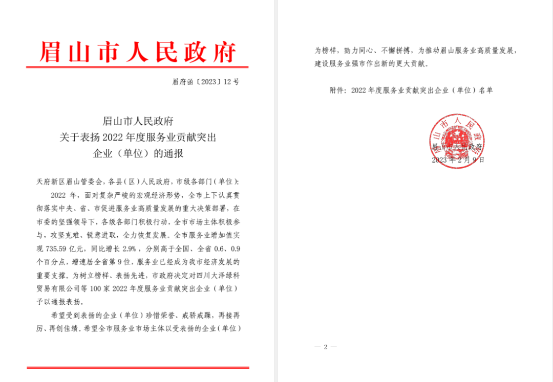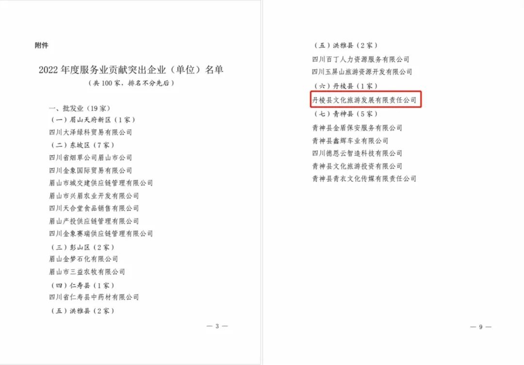 點贊!丹棱縣文化旅游發(fā)展有限責(zé)任公司榮獲眉山市2022年度服務(wù)業(yè)貢獻(xiàn)突出企業(yè)榮譽(yù)稱號
